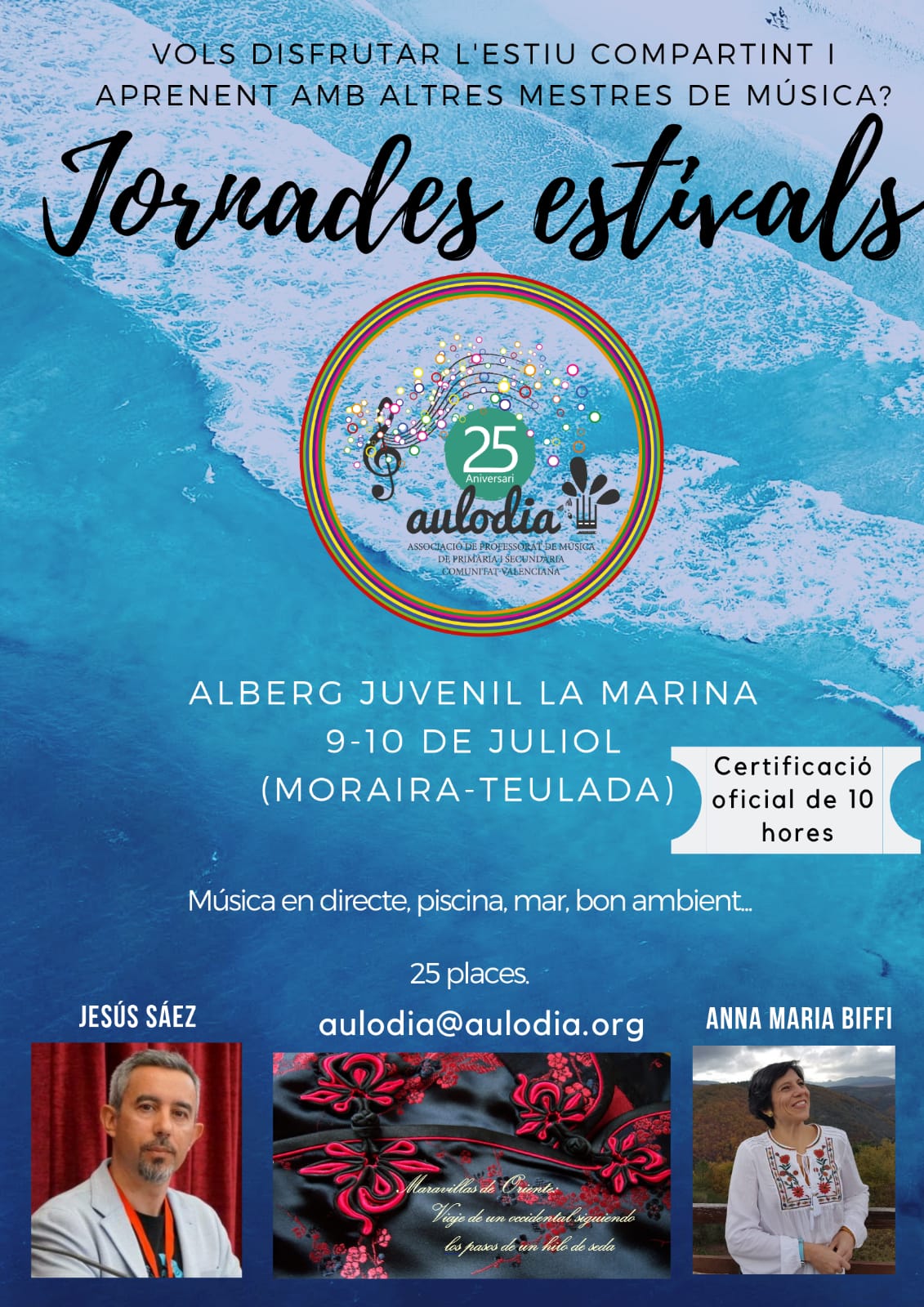 Iniciamos un nuevo formato de formación, unas Jornadas Estivales en el Albergue «La Marina» de Moraira (Alicante). Compartiremos 10 horas de formación con los profesores Anna Maria Biffi y Jesús Sáez realizando talleres muy sugerentes en los que cantaremos, bailaremos y tocaremos en un ambiente fresco como es del Albergue Juvenil.