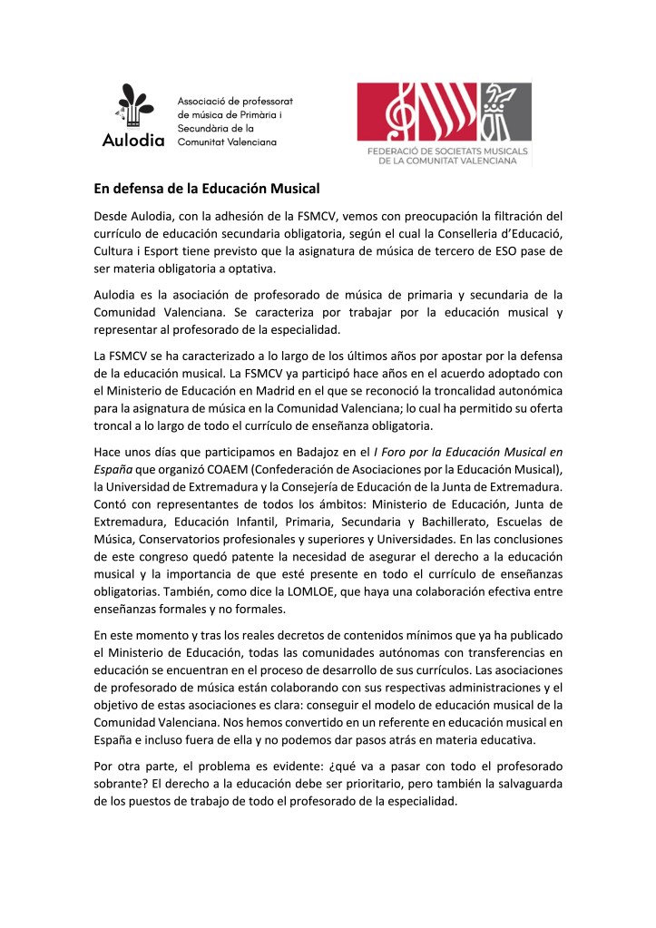 En esta publicació podeu veure el comunicat que ha elaborat Aulodia junt amb suport de la Federació de Societats Musicals de la Comunitat Valenciana (FSMCV) en defensa de l’Educació Musical arran la filtració del nou currículum de secundària que esmentava que l’assignatura de música deixaria d’estar present en 3r d’ESO com a matèria obligatòria.
