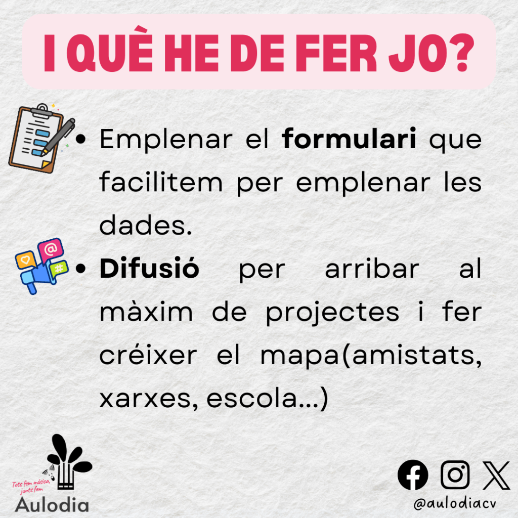 - Difusió per arribar al màxim de projectes i fer créixer el mapa(amistats, xarxes, escola…)