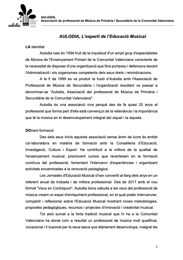 AULODIA no ha cesado de insistir, a través de entrevistas con representantes de la Administración y de las Organizaciones sindicales, en la necesidad de mejorar las condiciones en que se imparte la Educación Musical en la enseñanza obligatoria. A finales de 1999 se produjo la fusión de Aulodia con la Asociación de Profesorado de Música de Secundaria. La organización resultante ha pasado a denominarse Aulodia Associació del professorat de Música de Primària i Secundària de la Comunitat Valenciana.