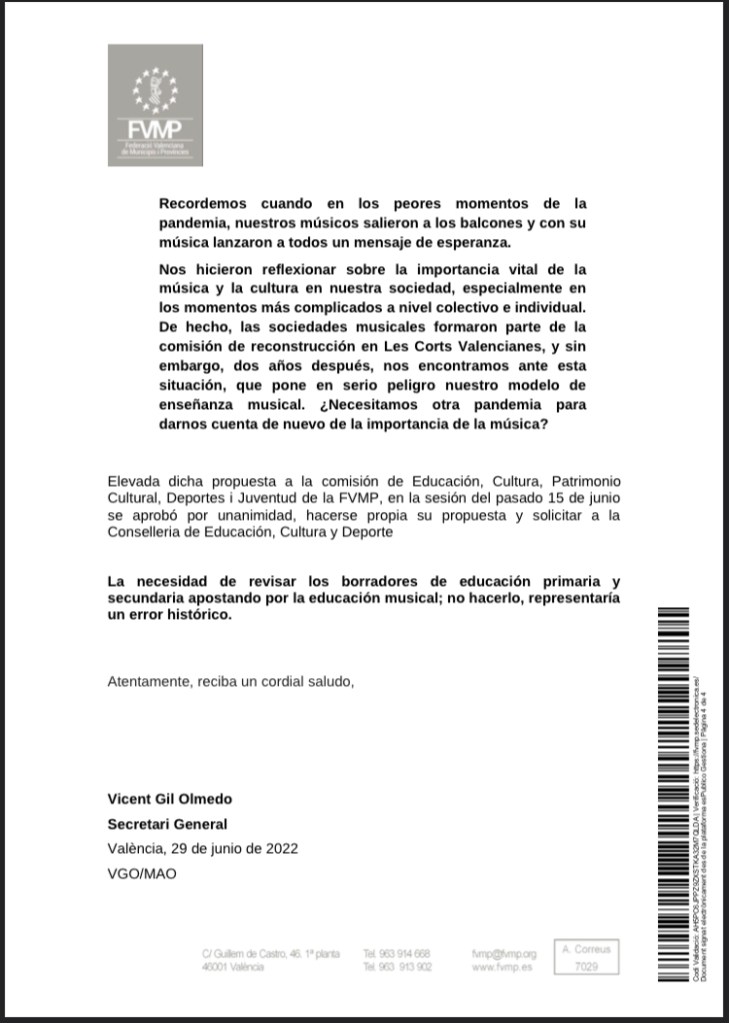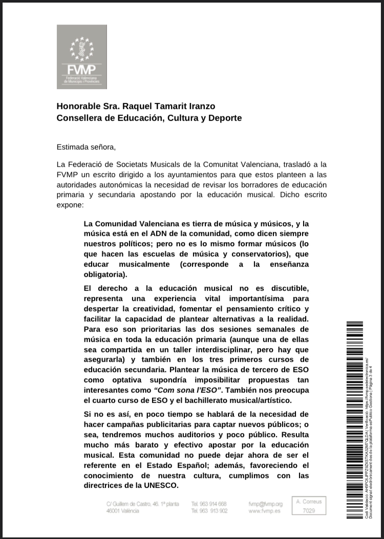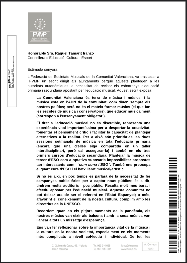 Carta de la Federació Valenciana de Municipis i Províncies (FVMP) en defensa d’Educació Musical arran de l’escrit de la Federació de Societats Musicals de la Comunitat Valenciana (FSMCV).
